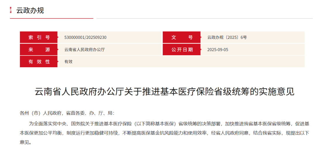 9月8日,云南省人民政府办公厅发布《关于推进基本医疗保险省级统筹的实施意见》,自2025年10月15日起施行。