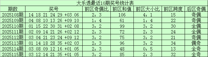 大乐透第25115期奖号为:03、12、14、21、35+01、05。其中前区和值为85,奇偶比为3:2,大小比为2:3。后区为全小、全奇组合。