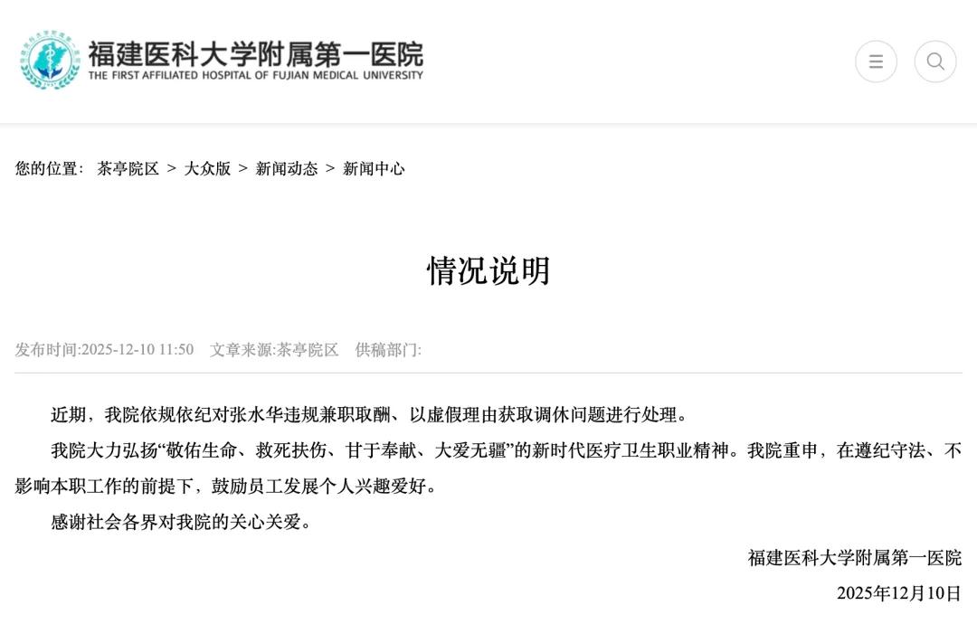 中国网12月10日讯12月10日中午,福建医科大学附属第一医院发布情况说明:近期,该院依规依纪对张水华违规兼职取酬、以虚假理由获取调休问题进行处理。