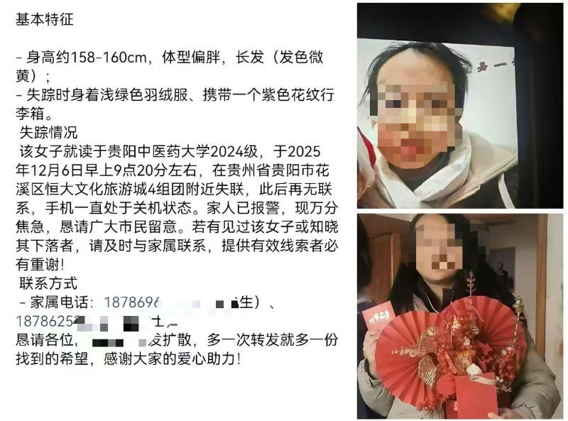 寻人启事信息显示,黄某某今年19岁,身高160厘米左右,于2025年12月6日早上9点20分左右,在贵州省贵阳市花溪区恒大文化旅游城4组团附近失联,失联时身着浅绿色羽绒服,携带一个紫色花纹行李箱。事发后家属万分焦急,随即报警。